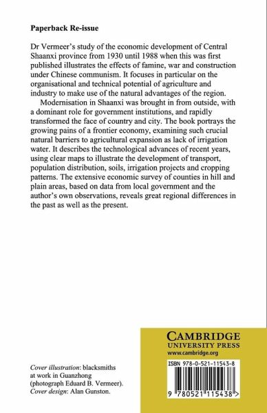 Dr Vermeer's study of the economic development on Central Shaanxi province from 1930 until 1988, when this was first published, illustrates the effects of famine, war and construction under Chinese communism. It focuses in particular on the organisational and technical potential of agriculture and industry to make use of the natural advantages of the region. Modernisation in Shaanxi was brought in from outside, with a dominant role for government institutions, and rapidly transformed the face of country and city. The book portrays the growing pains of a frontier economy, examining such crucial natural barriers to agricultural expansion as lack of irrigation water. It describes the technological advances, using clear maps to illustrate the development of transport, population distribution, soils, irrigation projects and cropping patterns. The extensive economy survey of counties in hill and plain areas, based on data from local government and the author's own observations, reveals great regional differences.