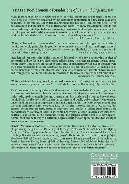 This book serves as a compact introduction to the economic analysis of law and organization. At the same time it covers a broad spectrum of issues. It is aimed at undergraduate economics students who are interested in law and organization, law students who want to know the economic basis for the law, and students in business and public policy schools who want to understand the economic approach to law and organization. The book covers such diverse topics as bankruptcy rules, corporate law, sports rules, the organization of Congress, federalism, intellectual property, crime, accident law, and insurance. Unlike other texts on the economic analysis of law, this text is not organized by legal categories but by economic theory. The purpose of the book is to develop economic intuition and theory to a sufficient degree so that one can apply the ideas to a variety of areas in law and organization.