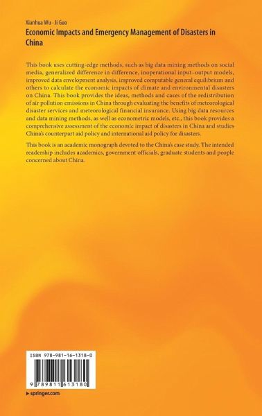This book uses cutting-edge methods, such as big data mining methods on social media, generalized difference in difference, inoperational input-output models, improved data envelopment analysis, improved computable general equilibrium and others to calculate the economic impacts of climate and environmental disasters on China. This book provides the ideas, methods and cases of the redistribution of air pollution emissions in China through evaluating the benefits of meteorological disaster services and meteorological financial insurance. Using big data resources and data mining methods, as well as econometric models, etc., this book provides a comprehensive assessment of the economic impact of disasters in China and studies China's counterpart aid policy and international aid policy for disasters.