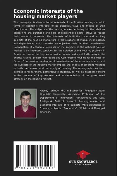 The monograph is devoted to the research of the Russian housing market in terms of economic interests of its subjects, ways and means of their coordination. The subjects of the housing market, entering into the relations concerning the purchase and sale of residential objects, strive to realize their economic interests. The interests of both the main and auxiliary subjects of the housing market are in the relations of mutual inconsistency and dependence, which provides an objective basis for their coordination. Coordination of economic interests of the subjects of the national housing market is an important condition for the solution of the housing problem in Russia as one of the key social and economic tasks set forth today in the priority national project "Affordable and Comfortable Housing for the Russian Citizens". Increasing the degree of coordination of the economic interests of the subjects of the housing market implies the impact of different methods on both the demand and the supply of housing. The monograph may be of interest to researchers, postgraduate students, as well as practical workers in the process of improvement and implementation of the government strategy on the housing market.