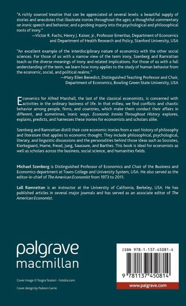 Economics for Alfred Marshall, the last of the classical economists, is concerned with activities in the ordinary business of life. In that milieu, we find conflicts and chaotic behavior among people, firms, and countries, which make them conduct their affairs in different, and sometimes, ironic ways. Economic Ironies Throughout History explores, explains, predicts, and harnesses these ironies for economists and scholars alike.Szenberg and Ramrattan distill their core economic ironies from a vast history of philosophy and literature that applies to economic thought. They include philosophical, psychological, literary and linguistic discussions and the personalities behind those ideas such as Socrates, Kierkegaard, Hume, Freud, Jung, Saussure, and Barthes. This book is ideal for economists as well as scholars across the business, social science, and humanities fields.