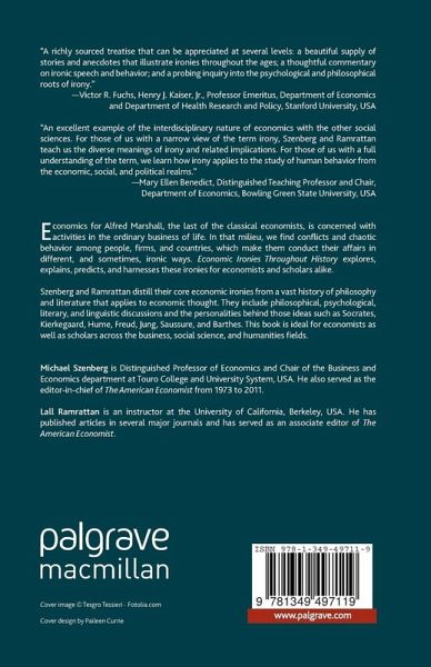 Economics for Alfred Marshall, the last of the classical economists, is concerned with activities in the ordinary business of life. In that milieu, we find conflicts and chaotic behavior among people, firms, and countries, which make them conduct their affairs in different, and sometimes, ironic ways. Economic Ironies Throughout History explores, explains, predicts, and harnesses these ironies for economists and scholars alike.Szenberg and Ramrattan distill their core economic ironies from a vast history of philosophy and literature that applies to economic thought. They include philosophical, psychological, literary and linguistic discussions and the personalities behind those ideas such as Socrates, Kierkegaard, Hume, Freud, Jung, Saussure, and Barthes. This book is ideal for economists as well as scholars across the business, social science, and humanities fields.