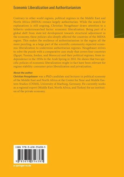 Contrary to other world regions, political regimes in the Middle East and North Africa (MENA) remain largely authoritarian. While the search for explanations is still ongoing, Christian Neugebauer draws attention to a hitherto underresearched factor: economic liberalization. Being part of a global shift from state-led development towards structural adjustment in the economy, these policies also deeply affected the countries of the MENA region. This makes the resilience of authoritarianism in the region all the more puzzling, as a large part of the scientific community expected economic liberalization to undermine authoritarian regimes. Neugebauer strives to solve the puzzle with a comparative case study that covers four countries (Egypt, Tunisia, Jordan, and Morocco) and their political regimes, from independence in the 1950s to the Arab Spring in 2011. He shows that two specific policies of economic liberalization might in fact have been relevant for regime stability: consumer-price liberalization and privatization.