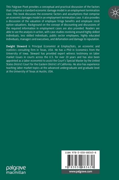 This Palgrave Pivot provides a conceptual and practical discussion of the factors that comprise a standard economic damage model in an employment termination case. This book discusses the economic factors and assumptions that comprise an economic damages model in an employment termination case. It also provides a discussion of the valuation of employee fringe benefits and employee stock option valuations. Background on the concept of discounting and discussions of the required information in employment cases are also provided. Readers are able to see the analysis in action, with case studies revolving around highly skilled individuals, less skilled individuals, public sector employees, highly educated individuals, managers and executives, and defamation and damage to reputation.