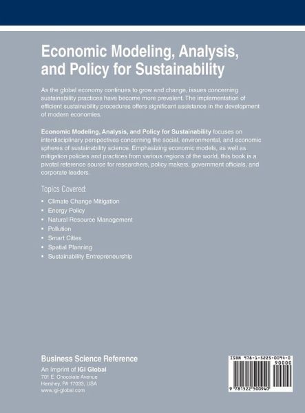 As the global economy continues to grow and change, issues concerning sustainability practices have become more prevalent. The implementation of efficient sustainability procedures offers significant assistance in the development of modern economies. Economic Modeling, Analysis, and Policy for Sustainability focuses on interdisciplinary perspectives concerning the social, environmental, and economic spheres of sustainability science. Emphasizing economic models, as well as mitigation policies and practices from various regions of the world, this book is a pivotal reference source for researchers, policy makers, government officials, and corporate leaders.