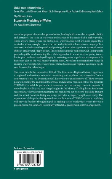 The book details the innovative TERM (The Enormous Regional Model) approach to regional and national economic modeling, and explains the conversion from a comparative-static to a dynamic model. It moves on to an adaptation of TERM to water policy, including the additional theoretical and database requirements of the dynamic TERM-H2O model. In particular, it examines the contrasting economic impacts of water buyback policy and recurring droughts in the Murray-Darling Basin. South-east Queensland, where climate uncertainty has been borne out by record-breaking drought and the worst floods in living memory, provides a chapter-length case study. The exploration of the policy background and implications of TERM's dynamic modeling will provide food for thought in policy making circles worldwide, where there is a pressing need for solutions to similarly intractable problems in water management.