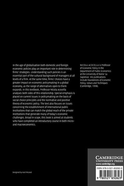 In the age of globalisation both domestic and foreign economic policies play an important role in determining firms' strategies. Understanding such policies is an essential part of the cultural background of managers at all levels of a firm. At the same time, firms' choices have a greater impact on economic policymaking in a global economy, as the range of alternatives open to them expands. In this textbook, Professor Acocella analyses both sides of this relationship. Special emphasis is placed on current issues: in policymaking on the basis of social choice principles and the normative and positive theory of economic policy; and issues concerning the establishment of international public institutions that can match the global reach of the private institutions (markets and firms) that generate many of today's economic challenges. Broad in scope, this book is aimed at students who have completed an introductory course in both micro and macroeconomics.