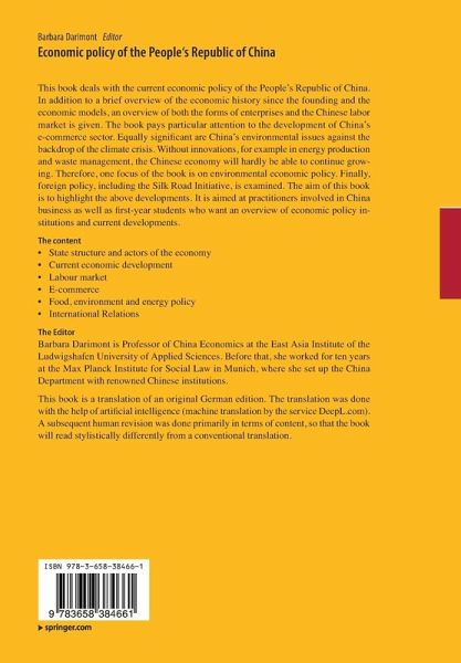 This book deals with the current economic policy of the People's Republic of China. In addition to a brief overview of economic history since its founding and discussions of economic models, an overview of both the forms of business and the Chinese labor market is provided. The book pays particular attention to the development of China's e-commerce sector. Equally significant are China's environmental issues against the backdrop of the climate crisis. Without innovations, for example in energy production and waste management, the Chinese economy will hardly be able to continue growing. Therefore, one focus of the book is on economic policy in the environmental sector. Finally, foreign policy, including the Silk Road Initiative, is examined. The aim of this book is to highlight the above developments. It is aimed at laypersons involved in the business of China as well as first-year students who want an overview of economic policy institutions and current developments.