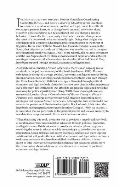The Montgomery bus boycott, Student Nonviolent Coordinating Committee (SNCC), and Brown v. Board of Education reveal incentives to reform as a result of economic, political and legal threat. It is difficult to change a person's heart, or to change based on moral conviction alone. However, policies and laws can be established that will change a person's behavior. Historically, there was rarely a time where societal changes were the result of a desire to do what was morally right. Doing what is right was contingent upon economic advantages, political motivation or the threat of litigation. By the mid 1900s the NAACP had learned a valuable lesson in the South, that litigation or the threat of litigation was an effective tool in the quest for educational equality (Douglas, 1995). More recently, the #metoo movement and the Los Angeles teacher's strike exposed corrupt behavior and insufficient working environments that have existed for decades. What is different? They have been exposed through political, economic and legal means. As it pertains to educating African Americans, there was an ongoing role of servitude in the political economy of the South (Anderson, 1988). This was subsequently disrupted through political, economic, and legal measures during Reconstruction. Racist ideologies and economic advantages were seen through Jim Crow Laws (Roback, 1984) that were again disrupted through political, economic, and legal methods. Education has also been cited as what perpetuates our democracy. It is institutions that afford its citizens the skills and knowledge necessary for political participation (Rury, 2002). Even when legal cases are unsuccessful, such as Puitt v. Commissioners of Gaston County or Plessy v. Ferguson, they can forge the way to successful litigation dismantling racist ideologies that oppress African Americans. Although the Puitt decision did not remove the processes of discrimination against Black schools, it left intact the legal basis on segregated and unequal education (Douglas, 1995). As citizens, it is imperative that we participate in the political process and use our authority to mandate the changes we would like to see in urban education. When theorizing this book, the intent was to provide an interdisciplinary look at solutions to critical issues in urban education through political, economic, and legal avenues. This book seeks to provide an interdisciplinary approach to solving the issues in education while connecting it to the effects on teacher preparation. Using historical and recent examples, scholars can piece together solutions that will guide others to political, economic, and legal action necessary to dismantle systems that have bound Black and Brown children. It is our intent to offer innovative, yet grounded solutions that can purposefully move the conversation about solutions to critical issues in education to political, economic, and legal actions.