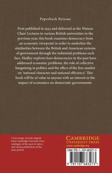 First published in 1923 and delivered as the Watson Chair Lectures to various British universities in the previous year, this book examines democracy from an economic viewpoint in order to underline the similarities between the British and American systems of government through the industrial problems each face. Hadley explores how democracies in the past have addressed economic problems, the role of collective bargaining in politics and the effect of the free market on 'national character and national efficiency'. This book will be of value to anyone with an interest in the impact of economics on democratic governments.