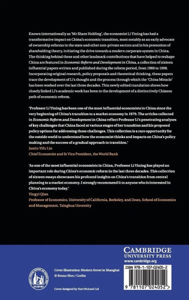 Known internationally as 'Mr Share Holding', the economist Li Yining has had a transformative impact on China's economic transition, most notably as an early advocate of ownership reforms in the state and other non-private sectors and in his promotion of shareholding theory, initiating the drive towards a modern corporate system in China. The thinking behind these and other landmark contributions that have helped to reshape China are featured in Economic Reform and Development in China, a collection of sixteen influential papers written and published during the reform period, from 1980 to 1998. Incorporating original research, policy proposals and theoretical thinking, these papers trace the development of Li's thought and the process through which the 'China Miracle' has been worked over the last three decades. This newly edited translation introduces how inextricably linked Li's academic work has been to the development of a distinctively Chinese path of economic reform.