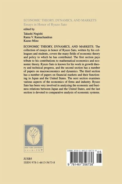 Economic Theory, Dynamics, and Markets. The collection of essays in honor of Ryuzo Sato, written by his colleagues and students, covers the many fields of economic theory and policy to which he has contributed. The first section pays tribute to his contributions to mathematical economics and economic theory. Ryuzo Sato is known for his work in growth theory and technical progress, and the second section has a number of papers on macroeconomics and dynamics. The third section has a number of papers on financial markets and their functioning in Japan and the United States. The next section examines various aspects of the economics of firms and industry. Ryuzo Sato has been very involved in analyzing the economic and business relations between Japan and the United States, and the last section is devoted to comparative analysis of economic systems.