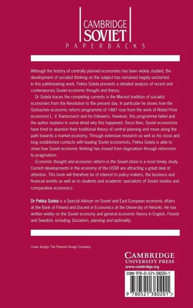 Although the history of centrally planned economies has been widely studied, the development of socialist thinking on the subject has remained largely uncharted. In this 1991 work, Pekka Sutela presents a detailed analysis of Soviet economic thought and theory. Dr Sutela traces the competing currents in the Marxist tradition of socialist economies from the Revolution to the present day. In particular he shows how the Gorbachev economic reform programme of 1987 rose from the work of Nobel Prize economist L. V. Kantorovich and his followers. However, this programme failed and the author explains in some detail why this happened. Since then, Soviet economists have tried to abandon their traditional theory of central planning and move along the path and long established contacts with leading Soviet economists, Pekka Sutela is able to show how Soviet economic thinking has moved from dogmatism through reformism to pragmatism.