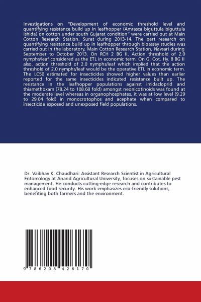 Investigations on "Development of economic threshold level and quantifying resistance build up in leafhopper (Amrasca biguttula biguttula Ishida) on cotton under south Gujarat condition" were carried out at Main Cotton Research Station, Surat during 2013-14. The part research on quantifying resistance build up in leafhopper through bioassay studies was carried out in the laboratory, Main Cotton Research Station, Navsari during September to October 2013. On RCH 2 BG II, Action threshold of 2.0 nymphs/leaf considered as the ETL in economic term. On G. Cot. Hy. 8 BG II also, action threshold of 2.0 nymphs/leaf which implied that the action threshold of 2.0 nymphs/leaf would be the operative ETL in economic term. The LC50 estimated for insecticides showed higher values than earlier reported for the same insecticides indicated resistance built up. The resistance in the leafhopper populations against imidacloprid and thiamethoxam (78.24 to 108.68 fold) amongst neonicotinoids was found at the moderate level whereas in organophosphates, it was at low level (9.29 to 29.04 fold) in monocrotophos and acephate when compared to insecticide exposed and unexposed field populations.