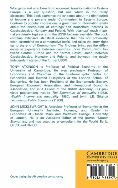 Who gains and who loses from economic transformation in Eastern Europe is a key question, but one which is too rarely discussed. This book, first published in 1992, examines the evidence about distribution of income under Communism in Eastern Europe. Contrary to popular impressions, a great deal of information exists about distribution of income and household earnings in Czechoslovakia, Hungary and Poland. With glasnost much material previously kept secret in the USSR has been made available. The book contains extensive statistical evidence that had not previously been assembled on a comparative basis, and brings the story right up to the end of Communism. The findings bring out the differences in experience between countries under Communism: between Central Europe and the former Union; between Czechoslovakia, Hungary and Poland; and between the newly independent states of the former Soviet Union.