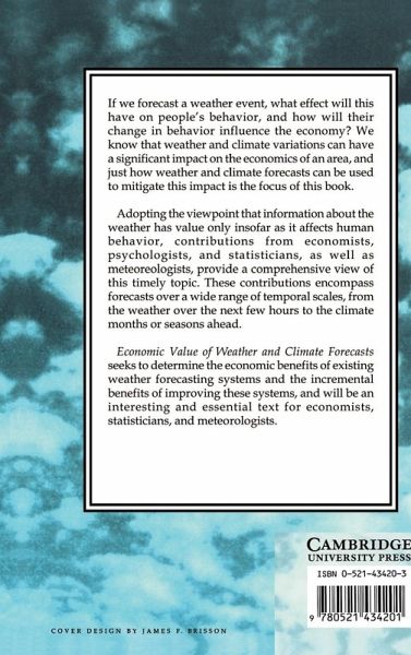 Weather and climate extremes can significantly impact the economics of a region. This book examines how weather and climate forecasts can be used to mitigate the impact of the weather on the economy. Interdisciplinary in scope, it explores the meteorological, economic, psychological, and statistical aspects of weather prediction. Chapters by area specialists provide a comprehensive view of this timely topic. They encompass forecasts over a wide range of temporal scales, from weather over the next few hours to the climate months or seasons ahead, and address the impact of these forecasts on human behavior. Economic Value of Weather and Climate Forecasts seeks to determine the economic benefits of existing weather forecasting systems and the incremental benefits of improving these systems, and will be an interesting and essential text for economists, statisticians, and meteorologists.