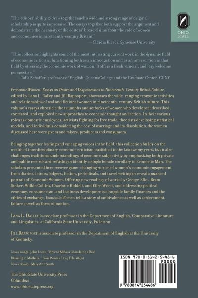 Economic Women: Essays on Desire and Dispossession in Nineteenth-Century British Culture, edited by Lana L. Dalley and Jill Rappoport, showcases the wide-ranging economic activities and relationships of real and fictional women in nineteenth-century British culture. This volume's essays chronicle the triumphs and setbacks of women who developed, described, contested, and exploited new approaches to economic thought and action. In their various roles as domestic employees, activists fighting for free trade, theorists developing statistical models, and individuals considering the cost of marriage and its dissolution, the women discussed here were givers and takers, producers and consumers. Bringing together leading and emerging voices in the field, this collection builds on the wealth of interdisciplinary economic criticism published in the last twenty years, but it also challenges traditional understandings of economic subjectivity by emphasizing both private and public records and refusing to identify a single female corollary to Economic Man. The scholars presented here recover game-changing stories of women's economic engagement from diaries, letters, ledgers, fiction, periodicals, and travel writing to reveal a nuanced portrait of Economic Women. Offering new readings of works by George Eliot, Bram Stoker, Willkie Collins, Charlotte Riddell, and Ellen Wood, and addressing political economy, consumerism, and business developments alongside the ethics of exchange and family finances, Economic Women tells a story of ambivalence as well as achievement, failure as well as forward motion.