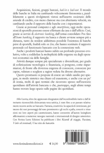Acquisizioni, fusioni, bail-in e bail-out. Il mondo delle banche sta cambiando velocemente fisionomia e, parallelamente a questi rivolgimenti vistosi nell'assetto societario, con meno clamore ma altrettanta velocità, sta cambiando anche il rapporto delle banche col risparmiatore. Oggi molte operazioni possono essere effettuate da casa o dall'ufficio e il rapporto tra banca e cliente è sempre più a distanza, tanto da rendere addirittura possibile l'esistenza di banche fruibili solo on line. Anche i prodotti bancari hanno subìto un profondo processo evolutivo, volto a soddisfare la molteplicità delle esigenze degli operatori economici e delle famiglie. Attività sempre più specializzate e diversificate, per grado di sofisticazione tecnologica o finanziaria, ci pongono, come risparmiatori, di fronte alla doverosa esigenza di conoscere, conoscere per capire, valutare e scegliere a ragion veduta fra diverse alternative. Questo prontuario si propone di spiegare, in modo sintetico ma chiaro, e anche con un po' di ironia, molti di quei termini che ricorrono spesso nell'attività bancaria o che, purtroppo, negli ultimi tempi hanno trovato largo spazio sulle pagine dei quotidiani.