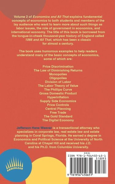 Volume 2 of Economics and All That explains fundamental concepts of economics to both students and members of the lay audience who want to learn more about such things as labor issues, the role of government in economics, and international economy. The title of this book is borrowed from the tongue-in-cheek thousand-year history of England called 1066 and All That, which has been a classic for almost a century. The book uses humorous examples to help readers understand many of the basic concepts of economics, some of which are: Price Discrimination The Law of Diminishing Returns Monopolies Oligopolies Division of Labor The Labor Theory of Value The Phillips Curve Gross Domestic Product Hyperinflation Supply Side Economics Price Controls Central Planning Free Trade The Gold Standard The Digital Economy Jefferson Hane Weaver is a transactional attorney who specializes in corporate law, real estate law and estate planning in Coral Springs, Florida. He earned a degree in Economics and Political Science at the University of North Carolina at Chapel Hill and received his J.D. and his Ph.D. from Columbia University.