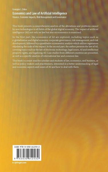 In the first part, the economics of AI are explored, including topics such as e-globalization and digital economy, corporate governance, risk management, and risk development, followed by a quantitative econometric analysis which utilizes regressions stipulating the scale of the impact. In the second part, the author presents the law of AI, covering topics such as the law of electronic technology, legal issues, AI and intellectual property rights, and legalizing AI. Case studies from different countries are presented, as well as a specific analysis of international law and common law.