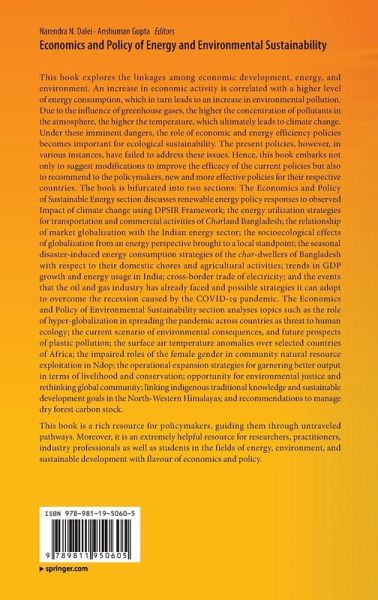 Chapter 1. Sustainable Energy and Environmental Sustainability in an Economics and Policy Prospective.- Section I: Economics and Policy of Sustainable Energy.- Chapter 2. Renewable Energy Policy Responses to Observed Impact of Climate Change: Evidence from DPSIR Framework.- Chapter 3. Energy Utilization Strategies for Transportation and Commercial Activities in the Precarious Habitat: A Case of Disaster Affected Communities in Charland Bangladesh.- Chapter 4. Era of Market Globalization: A Review of Energy Demand, Opportunities and Challenges in India.- Chapter 5. From global to local: empirical findings of socioecological effects of photovoltaic energy promotion in Brazilian Outback.- Chapter 6. Seasonal Disaster Induced Energy Consumption in Domestic Chores and Agricultural Activities: A Study of Two Padma Char Villages in Bangladesh.- Chapter 7. Trends in GDP Growth and Energy Usage in India.- Chapter 8. Resilience is what the Oil and Gas Industry has inherited - Reassessing, Analyzing and Mitigating the Risks in Current Situation and Proposing the Roadmap Ahead.- Chapter 9. Cross Border Trade of Electricity: Existing Scenario and Opportunities for India.- Section II: The Economic and Policy of Environmental Sustainability.- Chapter 10. COVID 19 Pandemic, Unsustainable Globalization, and IPR Regime: Identifying the Critical factors for Spread of COVID19 Virus.- Chapter 11. Single Use Plastics: An Escalating Global Environmental Problem.- Chapter 12. Environmental monitoring and assessment of Africa regional air temperature trend.- Chapter 13. Gender Biases in the Resource Exploitation and Management of Cameroonian Inland Wetlands Within the Upper Nun Valley, Ndop, North West Region.- Chapter 14. Community Hydrological Resources of Balikumbat Highlands Within The Upper Nun Valley Plains of Ndop, Cameroon: Blend of Stakeholder Management Complementarity And Cooperation Politics.- Chapter 15. Contemporary Institutional Approach towards Conservation: Operational Reorganization Strategies.- Chapter 16. Alli Kawsay - Buen vivir, epistemology in the indigenous communities of Ecuador and Colombia, an opportunity for environmental justice and rethinking the global community.- Chapter 17. Global Initiatives of Sustainable Development with Special Reference to Paris Agreement and its Challenges in South Asia.- Chapter 18. Linking Indigenous Traditional Knowledge and Sustainable Development Goals in the North-Western Himalayas.- Chapter 19. Green Human Resource Management: A Review and Bibliometric Analysis.- Chapter 20. Carbon sequestration dynamics of tree species in dry forest.
