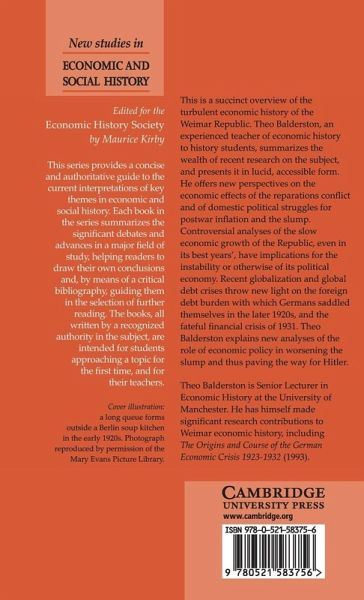This is a succinct overview of the turbulent economic history of the Weimar Republic. Theo Balderston, an experienced teacher of economic history, summarises the wealth of recent research on the subject, and presents it in lucid, accessible form. He offers new perspectives on the economic effects of the Reparations conflict and of domestic political struggles for postwar inflation and the slump. Controversial analyses of the slow economic growth of even the Republic's best years have implications for the instability or otherwise of its political economy. Recent globalisation and global debt crises throw new light on the foreign debt burden with which Germans saddled themselves in the later 1920s, and the fateful financial crisis of 1931. Theo Balderston explains new analyses of the role of economic policy in worsening the slump and thus paving the way for Hitler.