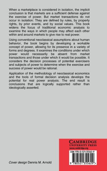When a marketplace is considered in isolation, the implicit conclusion is that markets are a sufficient defence against the exercise of power. But market transactions do not occur in isolation: they are defined by rules, property rights, prior events and social values. This book widens the focus of traditional economic analysis to examine the ways in which people may affect each other within and around markets to give rise to real power. Using conventional neoclassical assumptions about human behaviour, the book begins by developing a workable concept of power, allowing for its presence in a variety of forms and degrees. It examines the conditions under which power would necessarily be absent from market transactions and those under which it would be possible. It considers the decision processes of potential exercisers and subjects of power to determine when the exercise and success of power would be rational.