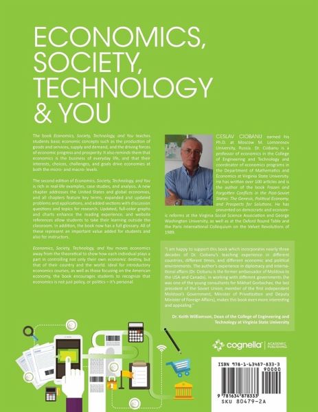 "I am happy to support this book which incorporates nearly three decades of Dr. Ciobanu’s teaching experience in different countries, different times, and different economic and political environments. The author’s experience in diplomacy and international affairs (Dr. Ciobanu is the former ambassador of Moldova to the USA and Canada), in working with different governments (he was one of the young consultants for Mikhail Gorbachev, the last president of the Soviet Union; member of the first independent Moldova’s Government, Minister of Privatization and Deputy Minister of Foreign Affairs), makes this book even more interesting and appealing." Dr. Keith Williamson, Dean of the College of Engineering and Technology at Virginia State University The book Economics, Society, Technology, and You teaches students basic economic concepts such as the production of goods and services, supply and demand, and the driving forces of economic progress and prosperity. It also reminds them that economics is the business of everyday life, and that their interests, choices, challenges, and goals drive economies at both the micro- and macro- levels. The second edition of Economics, Society, Technology, and You is rich in real-life examples, case studies, and analysis. A new chapter addresses the United States and global economies, and all chapters feature key terms, expanded and updated problems and applications, and added sections with discussion questions and topics for research. Updated, full-color graphs and charts enhance the reading experience, and website references allow students to take their learning outside the classroom. In addition, the book now has a full glossary. All of these represent an important value added for students and also for instructors. Economics, Society, Technology, and You moves economics away from the theoretical to show how each individual plays a part in controlling not only their own economic destiny, but that of their country and the world. Ideal for introductory economics courses, as well as those focusing on the American economy, the book encourages students to recognize that economics is not just policy, or politics – it’s personal. Ceslav Ciobanu earned his Ph.D. at Moscow M. Lomonosov University, Russia. Dr. Ciobanu is a professor of economics in the College of Engineering and Technology and coordinator of economics programs in the Department of Mathematics and Economics at Virginia State University. He has written over 100 articles and is the author of the book Frozen and Forgotten Conflicts in the Post-Soviet States: The Genesis, Political Economy, and Prospects for Solutions. He has presented on democratic and economic reforms at the Virginia Social Science Association and George Washington University, as well as at the Oxford Round Table and the Paris International Colloquium on the Velvet Revolutions of 1989.