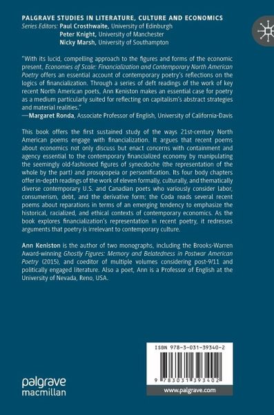 This book offers the first sustained study of the ways 21st century North American poems engage with financialization. It argues that recent poems about economics not only discuss but enact concerns with containment and agency essential to the contemporary financialized economy by manipulating the seemingly old-fashioned figures of synecdoche (the representation of the whole by the part) and prosopopeia or personification. Its four body chapters offer in-depth readings of the work of eleven formally, culturally, and thematically diverse contemporary U.S. and Canadian poets who variously consider labor, consumerism, debt, and the derivative form; the Coda reads several recent poems about reparations in terms of an emerging tendency to emphasize the historical, racialized, and ethical contexts of contemporary economics. As the book explores financialization's representation in recent poetry, it redresses arguments that poetry is irrelevant to contemporary culture.