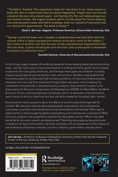 In this timely, cogent analysis of trends and powerful forces shaping global educational policy today, Joel Spring focuses on how economization is making economic growth and increased productivity the main goals of schools, and the ways these goals are achieved-including measuring educational policies by their costs and economic benefits, shaping family life to ensure productive workers and high-achieving students, introducing entrepreneurship education into curricula from preschool through higher education, and increasing the involvement of economists in educational policy analysis. Close attention is given to the Organization for Economic Cooperation and Development (OECD), the World Bank, the World Economic Forum, and multinational corporations, which, as advocates of economization, want schools to focus on teaching hard and soft skills needed by the global labor market. Economization raises questions about the effects of economically driven agendas for schools: Will education policies advocated by global organizations and multinational businesses corporatize and standardize human personalities and families? What type of global worker is being sought by global organizations and multinational corporations? What education programs are supported to educate the ideal global worker? What is the ideal family life for economic growth and development? Detailing and analyzing the politics and motivations driving economization, the book concludes with an assessment of the impacts of the confluence of business interests, economic theories, governments, and educators.