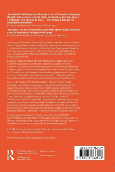 As we approach the end of the second millennium, we find ourselves in times of radical social change. Orthodox explanations of the economy, the environment and the development process are unable to provide coherent policies for such issues as employment creation, environmental degradation and social progress. Economy-Environment-Development-Knowledge provides alternative perspectives on these fundamental aspects of human existence. Economists, environmentalists, and development theorists have so far been unable to agree on the most successful prescriptions to address problems. To understand, contrast and compare alternative understandings of economic, environmental and development issues, we need to be aware why theorists conceptualise the process of social experience so differently. Part 1 of Economy-Environment-Development-Knowledge addresses the subjective preference, cost-of-production and abstract labour theories of values in economics; Part 2 explains egocentrism, ecocentrism and socioecocentrism as competing theoretical perspectives in environmental theory; Part 3 highlights modernisation theory, structuralist theory and class struggle as ways to account for the process of development and Part 4 examines the generation of knowedge through positivism, paradigms and praxis, legitimating competing perspectives in economics, environmentalist and development. The book concludes by considering why different people find alternative explanations more or less plausible. By addressing the disagreements between theorists, Economy-Environment-Development-Knowledge provides a unique basis to contrast and compare the plethora of theories of, and policies for, economic prosperity, environmental sustainability and social progress.