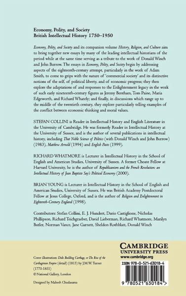 Economy, Polity and Society and its companion volume History, Religion and Culture aim to bring together new essays by many of the leading intellectual historians of the period. The essays in Economy, Polity and Society begin by addressing aspects of the eighteenth-century attempt, particularly in the work of Adam Smith, to come to grips with the nature of "commercial society" and its distinctive notions of the self, of political liberty, and of economic progress. They then explore the adaptations of and responses to the Enlightenment legacy in the work of such early nineteenth-century figures as Jeremy Bentham, Tom Paine, Maria Edgeworth and Richard Whately. Finally, in discussions that range up to the middle of the twentieth century, they explore particularly telling examples of the conflict between economic thinking and moral values.
