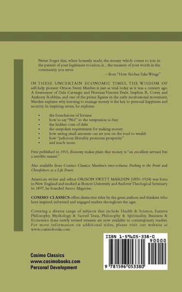 Never forget that, when honestly made, the money which comes to you in the pursuit of your legitimate vocation, is... the measure of your worth in the community you serve. -from "How Riches Take Wings" In these uncertain economic times, the wisdom of self-help pioneer Orison Swett Marden is just as vital today as it was a century ago. A forerunner of Dale Carnegie and Norman Vincent Peale, Stephen R. Covey and Anthony Robbins, and one of the prime figures in the early motivational movement, Marden explains why learning to manage money is the key to personal happiness and security. In inspiring terms, he explores: . the foundations of fortune . how to say "No!" to the temptation to buy . the hidden costs of debt . the unspoken requirement for making money . how saving small amounts can set you on the road to wealth . how "judicious liberality promotes prosperity" . and much more. First published in 1901, Economy makes plain that money is "an excellent servant but a terrible master." Also available from Cosimo Classics: Marden's two-volume Pushing to the Front and Cheerfulness as a Life Power. American writer and editor ORISON SWETT MARDEN (1850-1924) was born in New England and studied at Boston University and Andover Theological Seminary. In 1897, he founded Success Magazine.