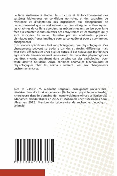 Le livre s'intéresse à étudié la structure et le fonctionnement des systèmes biologiques en conditions normales, et des capacités de résistance et d'adaptation des organismes aux changements de l'environnement que se soit naturels ou bien d'origine anthropiques. les chapitres de ce livre abordent les mécanismes mis en jeu pour faire face aux caractéristiques diverses des écosystèmes et les stratégies qui y sont associées. Le milieu terrestre par ses contraintes physico- chimiques spécifiques implique pour sa conquête et pour y survivre des changementsfonctionnels spécifiques tant morphologiques que physiologiques. Ces changements peuvent se traduire par des stratégies différentes mais tout aussi efficaces les unes que les autres. Il est prouvé que les facteurs agressifs de l'environnement amenuisent les capacités physiologiques des êtres vivants, entraînant dans certains cas des pathologies pour toute activité cellulaire. Ainsi, certaines anomalies biochimiques et physiologiques chez les animaux seraient liées aux changements environnementales.