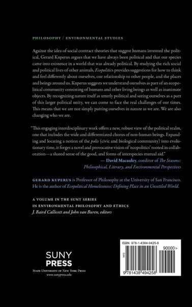 Against the idea of social contract theories that suggest humans invented the political, Gerard Kuperus argues that we have always been political and that our species came into existence in a world that was already political. By studying the rich social and political lives of other animals, Ecopolitics provides suggestions for how to think and feel differently about ourselves, our relationship to other people, and the places and beings around us. Kuperus suggests we understand ourselves as part of an ecopolitical community consisting of humans and other living beings as well as inanimate objects. By recognizing nature itself as utterly political and seeing ourselves as a part of this larger political unity, we can come to face the real challenges of our times. This means that we are not simply putting ourselves in nature as we are. We are also changing who we are.
