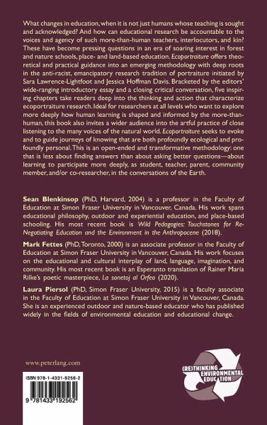 List of Illustrations - List of Tables - David W. Jardine: Foreword - Mark Fettes/Sean Blenkinsop/ Laura Piersol: Ecoportraiture: Researching in Resonance with the More-Than-Human - Nora Timmerman: Relationship, Complexity, Artistry, and Co-Creation in Portraiture Research - Kelly E. Keena: Getting to Goodness in a Green Schoolyard: Trusting the Process of Ecoportraiture - Laura Piersol: Developing Ecoportraiture: Lessons from the Caddisfly and other Beings - Sylvie de Grandpré: Indigenous Knowledge as Voice: Ecoportraiture and Indigenous Ways of Knowing - Michael Dé Danann Datura: Traversing a Mountain of Data: Ecoportraiture as Critical, Beautiful Risk - Sean Blenkinsop/Mark Fettes/ Laura Piersol: Epilogue: Humility, Resilience, Becoming: Ecoportraiture as Conversation - Contributors - Index.