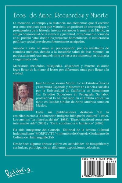 Ecos de Amor, Recuerdos y Muerte La memoria, el tiempo y la distancia son elementos que el escritor usa como recursos para que Mauricio, un profesor de antropología, y protagonista de la historia, intenta esclarecer la muerte de Memo, su amigo homosexual de la infancia y juventud, extrañamente ocurrida en su pueblo natal, donde los prejuicios homofóbicos, la intolerancia política y social prevalecen fuertemente arraigados. Aunado a esto, se suma su preocupación por los resultados de estudios médicos, debido a la inestable salud de José Manuel, su pareja, alterando aun más el ritmo de hasta ese momento, su rutinaria y organizada vida. Mezclando recuerdos, búsquedas, sinsabores y muerte, el autor logra llevar de la mano al lector por diferentes rutas para llegar a la verdad.