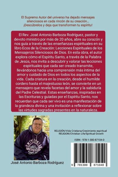 Ecos de la Creación: Lecciones Espirituales de los Mensajeros Silenciosos de Dios Embárcate en un viaje que explora las maravillas de la creación, donde cada criatura - desde la humilde hormiga hasta el majestuoso águila - revela verdades espirituales y mensajes de sabiduría divina. Inspirado en las Escrituras, Ecos de la Creación es una reflexión profunda sobre cómo los animales, aves e insectos no solo habitan la tierra, sino que también transmiten lecciones de perseverancia, humildad, fortaleza y fe. A través de historias conmovedoras y una interpretación cuidadosa de los textos sagrados, este libro invita al lector a detenerse, a observar la naturaleza con ojos renovados, y a descubrir en los seres más pequeños los ecos de un Creador que se revela en lo simple y lo sublime. En un mundo que a menudo olvida la esencia de lo divino en lo cotidiano, Ecos de la Creación nos recuerda la importancia de escuchar los silenciosos mensajes de Dios en la naturaleza.