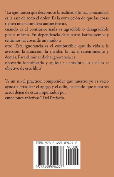 "La ignorancia que desconoce la realidad última, la vacuidad, es la raíz de todo el dolor. Es la convicción de que las cosas tienen una naturaleza autoexistente, cuando es al contrario: nada es agradable o desagradable por sí mismo. En dependencia de nuestro karma vemos y sentimos las cosas de un modo u otro. Esta ignorancia es el combustible que da vida a la aversión, la atracción, la envidia, la ira, el resentimiento y demás. Para eliminar dicha ignorancia es necesario identificarla y aplicar su antídoto, lo cual es el objetivo de este libro". "A un nivel práctico, comprender que nuestro yo es vacío ayuda a erradicar el apego y el odio, haciendo que nuestros actos dejen de estar impulsados por emociones aflictivas." Del Prefacio.