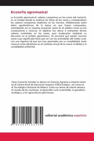 La Ecosofia agromusical: saberes campesinos en los sones del mariachi, es un trabajo donde se analizan las letras de los sones y contextualizan los saberes campesinos implícitos en los mismos, reflexionando sobre datos agrohistóricos de la época en que fueros compuestos, entendiendo así su impacto ecosocial, tanto en el público como en los compositores y músicos. El objetivo fue ubicar e interpretar dichos saberes contenidos en los sones, para revalorarlos mediante su discusión en el ámbito agronómico. Se encontró que existen muchos sones cuyo significado tiene que ver con las actividades del medio rural, con una vigencia tal que son muy apreciados por su complejidad, tanto musical como identitaria en el contexto actual de la nueva ruralidad y la complejidad ambiental.