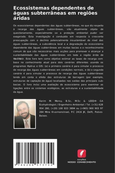 Os ecossistemas dependentes das águas subterrâneas, no que diz respeito à recarga das águas subterrâneas, são atualmente objeto de questionamento, especialmente se a proteção ambiental puder ser exagerada. Esta investigação é conduzida em resposta à crescente preocupação com o declínio potencialmente insustentável do nível das águas subterrâneas, a subsidência local e a degradação do ecossistema dependente das águas subterrâneas em muitas bacias e o reconhecimento comum de que são necessárias mais acções para promover e alcançar a sustentabilidade das águas subterrâneas em toda a região árida de WadiWatir. Este livro tem como objetivo estimar as taxas de recarga com base no conhecimento atual para dois cenários diferentes usando os programas Hydrus e GIS: (a) o primeiro cenário é para simular o processo de recarga das águas subterrâneas em condições normais, e (b) o segundo cenário é para simular o processo de recarga das águas subterrâneas tendo em conta o efeito das estruturas de barragem (por exemplo, estruturas de captação de água) localizadas nas saídas das principais sub-bacias. O livro inclui uma avaliação do ecossistema para examinar as ligações entre os sistemas ecológicos, as estruturas e a sustentabilidade da água.