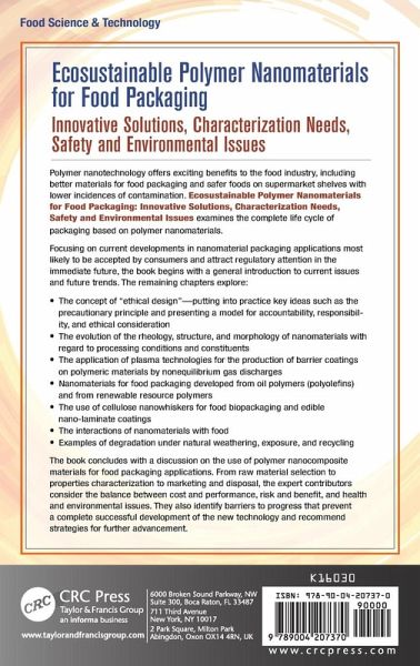Polymer nanotechnology offers exciting benefits to the food industry, including better materials for food packaging and safer foods on supermarket shelves with lower incidences of contamination. Ecosustainable Polymer Nanomaterials for Food Packaging: Innovative Solutions, Characterization Needs, Safety and Environmental Issues examines the complete life cycle of packaging based on polymer nanomaterials. Focusing on current developments in nanomaterial packaging applications most likely to be accepted by consumers and attract regulatory attention in the immediate future, the book begins with a general introduction to current issues and future trends. The remaining chapters explore: The concept of "ethical design"-putting into practice key ideas such as the precautionary principle and presenting a model for accountability, responsibility, and ethical consideration The evolution of the rheology, structure, and morphology of nanomaterials with regard to processing conditions and constituents The application of plasma technologies for the production of barrier coatings on polymeric materials by nonequilibrium gas discharges Nanomaterials for food packaging developed from oil polymers (polyolefins) and from renewable resource polymers The use of cellulose nanowhiskers for food biopackaging and edible nano-laminate coatings The interactions of nanomaterials with food Examples of degradation under natural weathering, exposure, and recycling The book concludes with a discussion on the use of polymer nanocomposite materials for food packaging applications. From raw material selection to properties characterization to marketing and disposal, the expert contributors consider the balance between cost and performance, risk and benefit, and health and environmental issues. They also identify barriers to progress that prevent a complete successful development of the new technology and recommend strategies for further advancement.