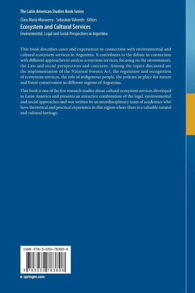 This book is one of the few research studies about cultural ecosystem services developed in Latin America and presents an attractive combination of the legal, environmental and social approaches and was written by an interdisciplinary team of academics who have theoretical and practical experience in this region where there is a valuable natural and cultural heritage.