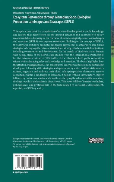 This open access book is a compilation of case studies that provide useful knowledge and lessons that derive from on-the-ground activities and contribute to policy recommendations, focusing on the relevance of social-ecological production landscapes and seascapes (SEPLS) to ecosystem restoration. Building on the concept of SEPLS, the Satoyama Initiative promotes landscape approaches as integrative area-based strategies to bring together diverse stakeholders aiming to balance multiple objectives, including conservation and development, for the benefit of biodiversity and human well-being. Many of the SEPLS case studies from the International Partnership for the Satoyama Initiative (IPSI) offer rich evidence to help guide restoration efforts while advancing relevant knowledge and practices. The book highlights how the efforts in managing SEPLS can contribute to ecosystem restoration and sustainable development, looking at the strategies and approaches by which multiple stakeholders express, negotiate, and embrace their plural value perspectives of nature to restore ecosystems within a landscape or seascape. It begins with an introductory chapter followed by twelve case studies and a synthesis clarifying the relevance of the case study findings to policy and academic discussions. This book will be of interest to scholars, policymakers and professionals in the field related to sustainable development, especially on SDGs 15 and 17.