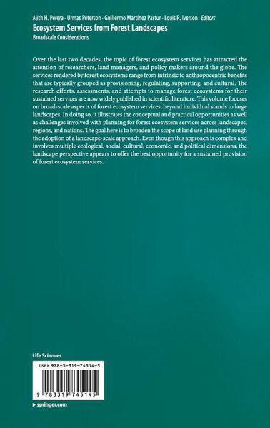 Over the last two decades, the topic of forest ecosystem services has attracted the attention of researchers, land managers, and policy makers around the globe. The services rendered by forest ecosystems range from intrinsic to anthropocentric benefits that are typically grouped as provisioning, regulating, supporting, and cultural. The research efforts, assessments, and attempts to manage forest ecosystems for their sustained services are now widely published in scientific literature. This volume focuses on broad-scale aspects of forest ecosystem services, beyond individual stands to large landscapes. In doing so, it illustrates the conceptual and practical opportunities as well as challenges involved with planning for forest ecosystem services across landscapes, regions, and nations. The goal here is to broaden the scope of land use planning through the adoption of a landscape-scale approach. Even though this approach is complex and involves multiple ecological, social, cultural, economic, and political dimensions, the landscape perspective appears to offer the best opportunity for a sustained provision of forest ecosystem services.
