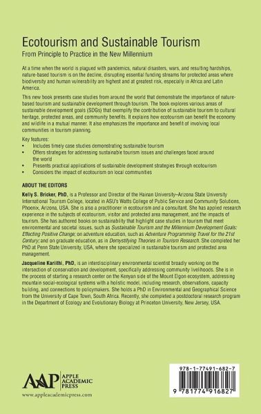 Kelly S. Bricker, PhD, is a Professor and Director of the Hainan University-Arizona State University International Tourism College, located in ASU's Watts College of Public Service and Community Solutions, Phoenix, Arizona, USA. She is also a practitioner in ecotourism and a consultant. She has applied research experience in the subjects of ecotourism, visitor and protected area management, and the impacts of tourism. She has authored books on sustainability that highlight case studies in tourism that meet environmental and societal issues, such as Sustainable Tourism and the Millennium Development Goals: Effecting Positive Change; on adventure education, such as Adventure Programming Travel for the 21st Century; and on graduate education, as in Demystifying Theories in Tourism Research. She completed her PhD at Penn State University, USA, where she specialized in sustainable tourism and protected area management. Jacqueline Kariithi, PhD, is an interdisciplinary environmental scientist broadly working on the intersection of conservation and development, specifically addressing community livelihoods. She is in the process of starting a research center on the Kenyan side of the Mount Elgon ecosystem, addressing mountain social-ecological systems with a holistic model, including research, observations, capacity building, and connections to policymakers. She holds a PhD in Environmental and Geographical Science from the University of Cape Town, South Africa. Recently, she completed a postdoctoral research program in the Department of Ecology and Evolutionary Biology at Princeton University, New Jersey, USA.