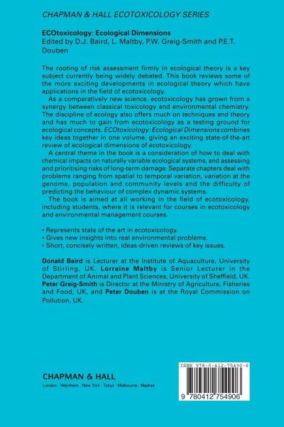 1 Putting the 'ECO-' into ECOtoxicology.- 2 Ecology in ecotoxicology: some possible 'rules of thumb'.- 2.1 Introduction.- 2.2 Reliability.- 2.3 Relevance.- 2.4 'Rules of thumb'.- 2.5 Conclusions.- References.- 3 Using demographic theory, community ecology and spatial models to illuminate ecotoxicology.- 3.1 Introduction.- 3.2 Stage-structured demographic models as an improvement on simply counting dead animals.- 3.3 Adapting recent advances in community ecology for predicting beyond single-species reponses in ecotoxicology.- 3.4 Using spatially explicit models to suggest how the scale and spatial patterning of a chemical stress influences its impact.- 3.5 Can ecology better serve environmental toxicology?.- 3.6 Conclusion.- Acknowledgements.- References.- 4 Indirect effects: concepts and approaches from ecological theory.- 4.1 Introduction.- 4.2 Simple types of indirect effects.- 4.3 Empirical studies to determine indirect effects.- 4.4 Estimating magnitudes of direct and indirect effects.- 4.5 Factors affecting the propagation of indirect effects.- 4.6 Indeterminacy of ecological interactions.- 4.7 Conclusions.- References.- 5 The dimensions of space and time in the assessment of ecotoxicological risks.- 5.1 Introduction.- 5.2 Space and time in ecotoxicology: arguments from first principles.- 5.3 Effects of temporal and spatial factors on ecotoxicological processes.- 5.4 The next steps in ecotoxicology.- References.- 6 Coping with variability in environmental impact assessment.- 6.1 Introduction.- 6.2 The nature of environmental variation.- 6.3 Variation and impact assessment.- 6.4 Study designs and their assumptions.- 6.5 On natural variation, pseudoreplication, power and scale.- 6.6 Conclusions.- Acknowledgements.- References.- 7 Environmental stress andthe distribution of traits within populations.- 7.1 Are responses to environmental stress general?.- 7.2 Key definitions.- 7.3 Population tolerance distributions.- 7.4 Sensitivity in toxicology.- 7.5 Sensitivity in ecology.- 7.6 Variability in asexual versus sexual populations.- 7.7 Stress-caused changes in variability.- 7.8 Evidence for increased variability in response to stress?.- 7.9 Predicting variance changes in response to stress.- 7.10 Detecting effects of stress on variable systems.- 7.11 Promising directions for future inquiry.- 7.12 Concluding remarks.- Acknowledgements.- References.