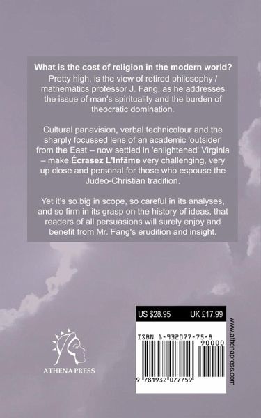 What is the cost of religion in the modern world? Pretty high, is the view of retired philosophy/mathematics professor J. Fang, as he addresses the issue of man's spirituality and the burden of theocratic denomination. Cultural panavision, verbal technicolour and the sharply focussed lens of an academic 'outsider' from the East - now settles in 'enlightened' Virginia -make 'Ecrasez L'Infame' very challenging, very up close and personal for those who espouse the Jeudo-Christian tradition. Yet it's so big in scope, so careful in its analyses, and so firm in its grasp of the history of ideas, that readers of all persuasions will surely enjoy and benefit from Mr. Fang's erudition and insight.