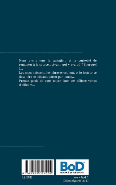 Nous avons tous la tentation, et la curiosité de remonter à la source... Avant, qui y avait-il ? Pourquoi ?...Les mots naissent, les phrases coulent, et le lecteur se désaltère se laissant porter par l'onde...Prenez garde de vous noyer dans ces délices venus d'ailleurs...