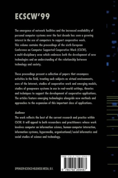 Taking the work out of workflow: Mechanisms for document-centered collaboration.- The Manufaktur: Supporting work practice in (landscape) architecture.- Six roles of documents in professionals' work.- AREA: A cross-application notification service for groupware.- Moving out of the meeting room: Exploring support for mobile meetings.- Activity Awareness: Framework for sharing knowledge of people, projects, and places.- The properties of mixed reality boundaries.- The adoption and use of BABBLE: A field study of chat in the workplace.- Meeting at the desktop: An empirical study of virtually collocated teams.- Broadcasting on-line social interaction as inhabited television.- A groupware' s life.- The network communities of SeniorNet.- GestureLaser and GestureLaser Car: Development of an embodied space to support remote instruction.- Exploring support for knowledge management in mobile work.- Dynamics in wastewater treatment: A framework for understanding formal constructs in complex technical settings.- WebDAV: A network protocol for remote collaborative authoring on the Web.- Informing collaborative information visualisation through an ethnography of ambulance control.- Moving document collections online: The evolution of a shared repository.- PSI: A Platform for Shared Interaction.- An experiment in interoperating heterogeneous collaborative systems.- NESSIE: An awareness environment for cooperative settings.- Meaning-making across remote sites: How delays in transmission affect interaction.- Augmenting the workaday world with Elvin.- Index of Authors.